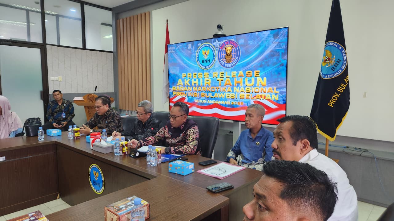 MAKASSAR — Badan Narkotika Nasional Provinsi Sulawesi Selatan (BNNP Sulsel) membeberkan capaian kinerja sepanjang tahun 2025 dalam rilis akhir tahun yang digelar di Makassar, Selasa (30/12).