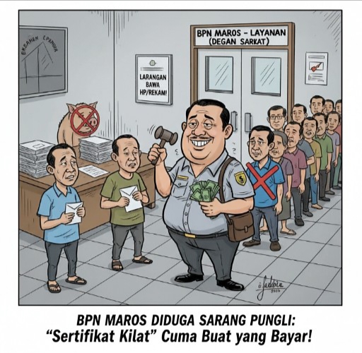 MAROS — Dugaan praktik pungutan liar (pungli) kembali mencoreng citra pelayanan publik di Kantor Badan Pertanahan Nasional (BPN) Kabupaten Maros. Informasi yang dihimpun Metrosulsel.com menyebutkan, proses pengurusan sertifikat tanah di kantor tersebut diduga sering “mendahulukan yang bayar” alias memberikan prioritas kepada pemohon yang menyetor uang pelicin.