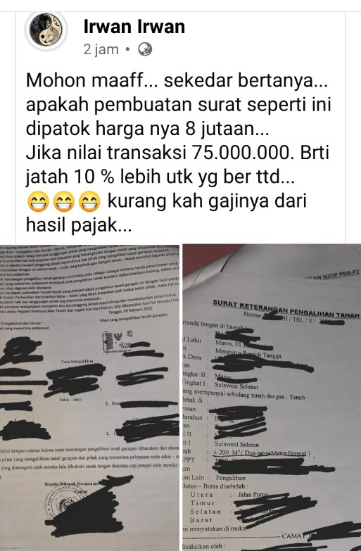 MAROS – Dugaan pungutan liar kembali menghantui birokrasi di Kabupaten Maros. Seorang camat di Kecamatan Tanralili disebut menerbitkan Surat Keterangan Peralihan Tanah Garapan pada Januari 2025, dengan menarik pungutan sebesar Rp8 juta dari pemohon.