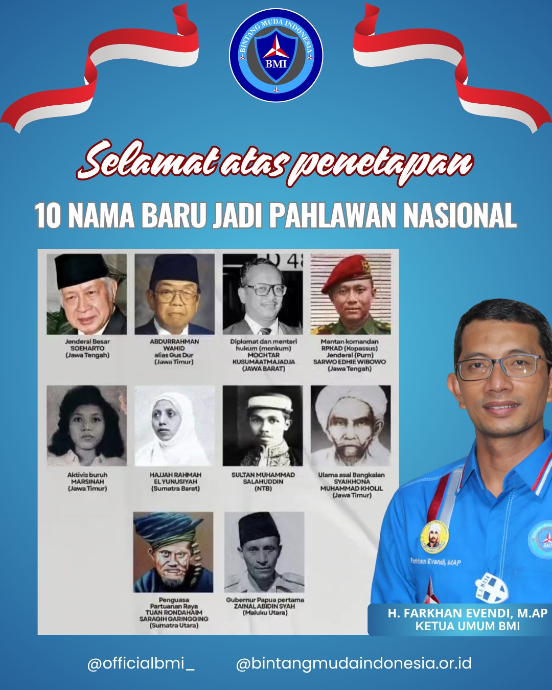 JAKARTA — Ketua Umum DPN Bintang Muda Indonesia (BMI), Farkhan Evendi, menanggapi polemik penetapan Presiden ke-2 RI Soeharto sebagai Pahlawan Nasional. Menurutnya, perdebatan publik yang muncul merupakan konsekuensi dari belum matang dan belum konsistennya negara dalam memahami makna kepahlawanan.