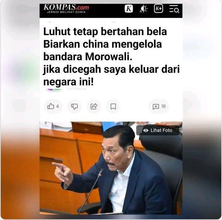 JAKARTA — Informasi yang beredar di media sosial berupa tangkapan layar berita dengan narasi “Luhut tetap bertahan bela. Biarkan China mengelola Bandara Morowali. Jika dicegah saya keluar dari negara ini!” dipastikan TIDAK BENAR atau HOAKS.