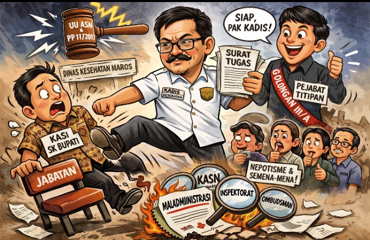 MAROS — Dugaan penyalahgunaan kewenangan kembali mencoreng tata kelola birokrasi di lingkup Pemerintah Kabupaten Maros. Kepala Dinas Kesehatan Maros diduga melangkahi kewenangan Bupati selaku Pejabat Pembina Kepegawaian (PPK) dengan menggeser dan menunjuk pejabat struktural setingkat Kepala Seksi (Kasi) hanya bermodalkan surat tugas, tanpa Surat Keputusan (SK) Bupati sebagaimana diatur dalam Undang-Undang Nomor 5 Tahun 2014 tentang ASN dan PP Nomor 11 Tahun 2017 tentang Manajemen PNS.